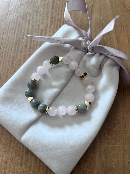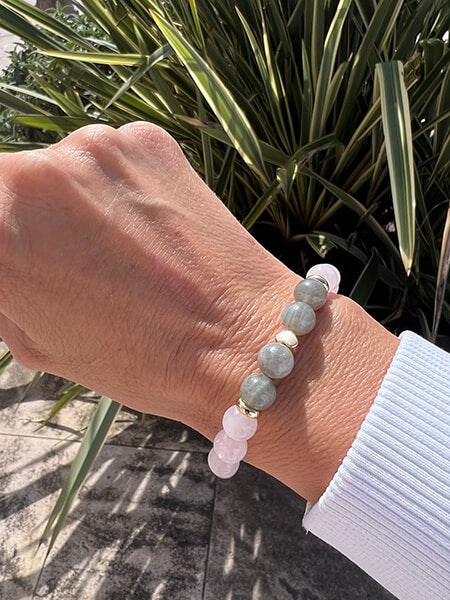 Le Bracelet Quartz Rose et Labradorite Étreinte Astrale™ a été imaginé comme une alliance entre deux pierres naturelles complémentaires : le quartz rose, symbole d’amour et de paix intérieure, et la labradorite, reconnue pour ses vertus de protection énergétique.